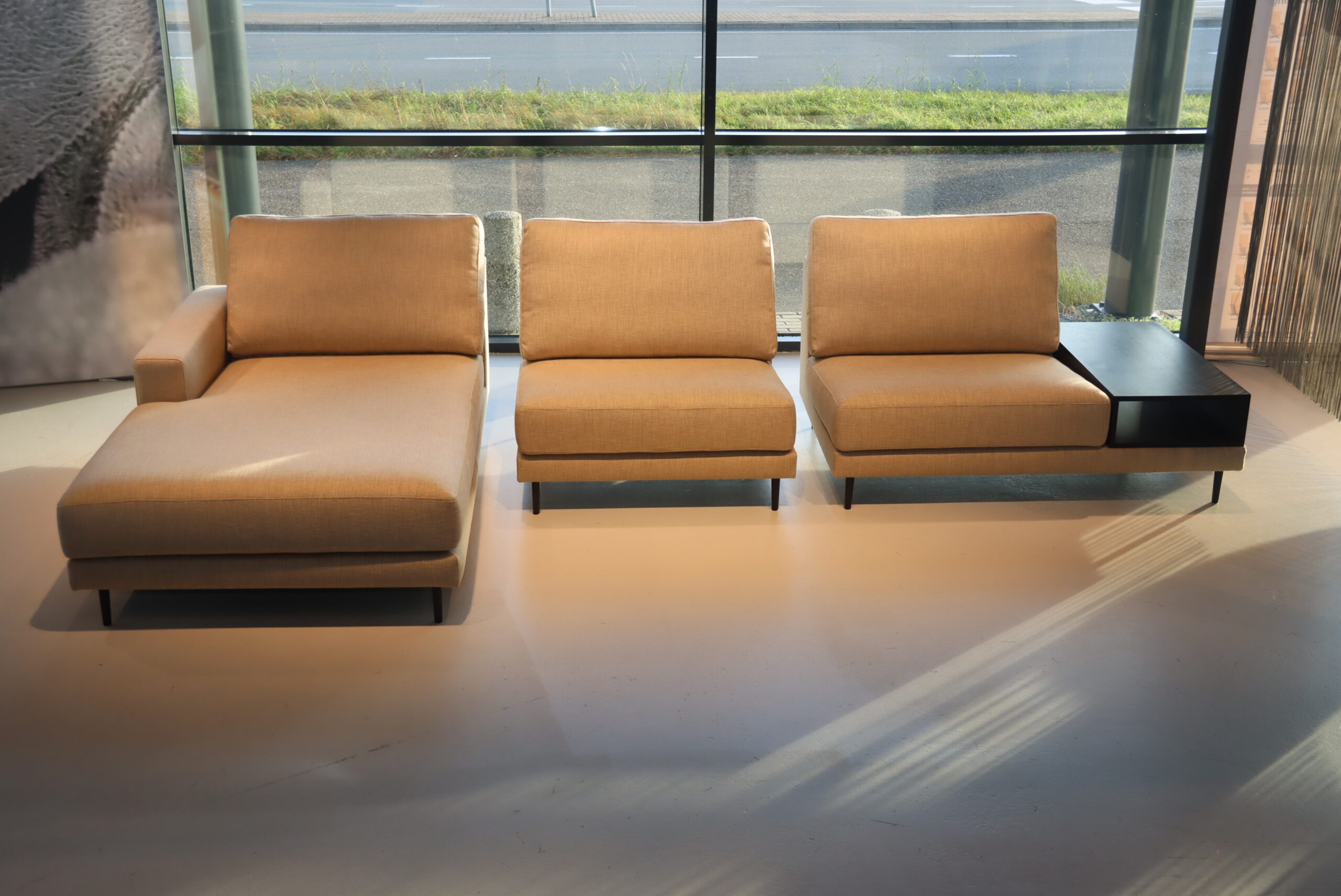Model: Flex Lounge met hoge rug en Ligelement van Cartel Living. Lange kant 368 cm x Korte kant (ligelement) 190 cm.