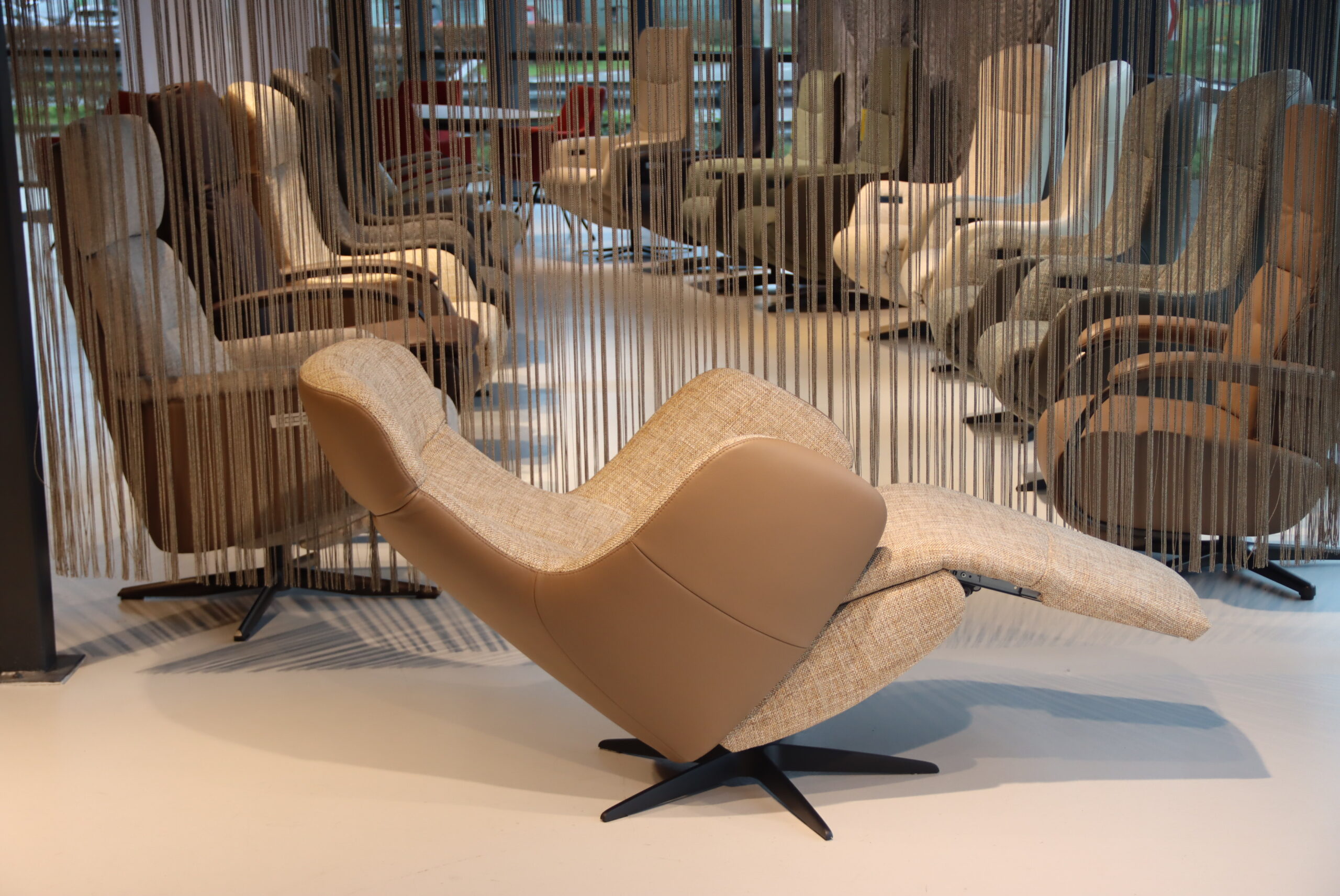 Elektrisch verstelbare relaxfauteuil / relaxstoel met sta op hulp / sta-op-stoel Twice Pro TW-305N van meubelfabriek De Toekomst in combi. Ploegstof Mida 92 / Leer Prestige Noce met 3 motoren en een accu. direct leverbaar.