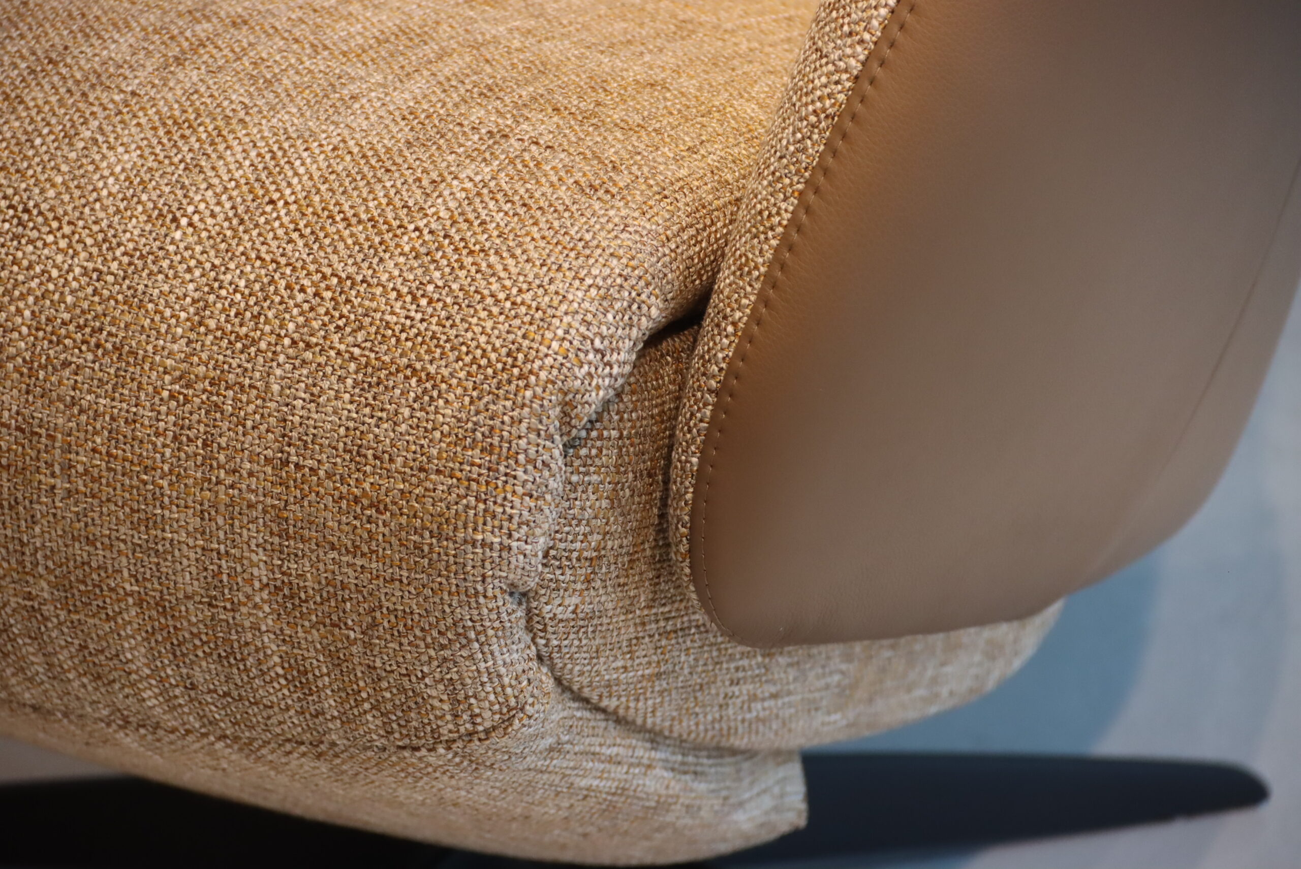Bekleding: Buitenkant in rundleder Prestige Noce. Binnenkant in Ploegstof Mida 92.