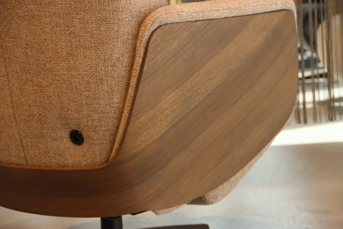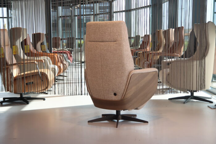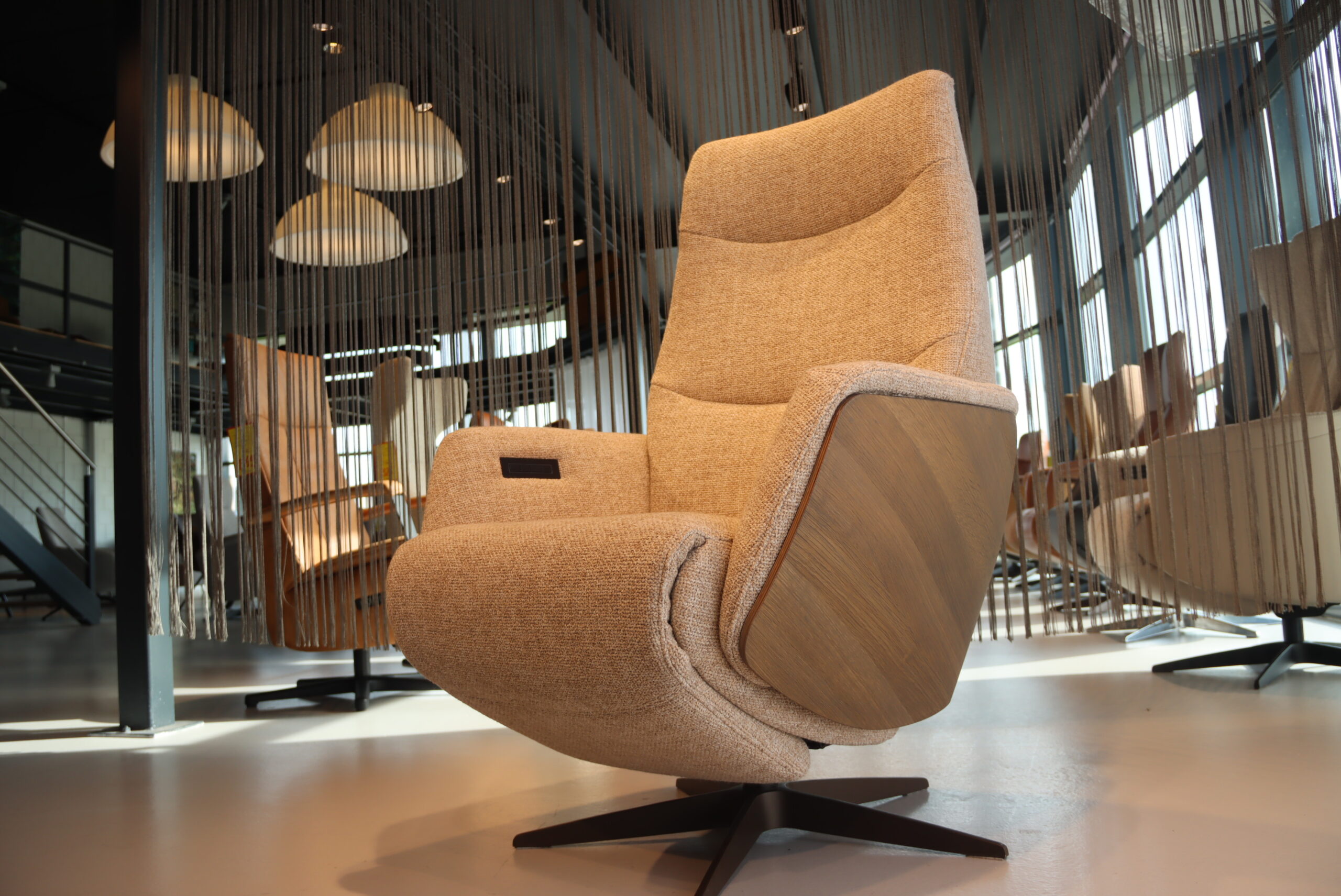 Home Assortiment Outlet Relaxfauteuil Twice TW-274N met houten Schaal van De Toekomst in Ploegstof met 3 motoren en een accu. Direct leverbaar.